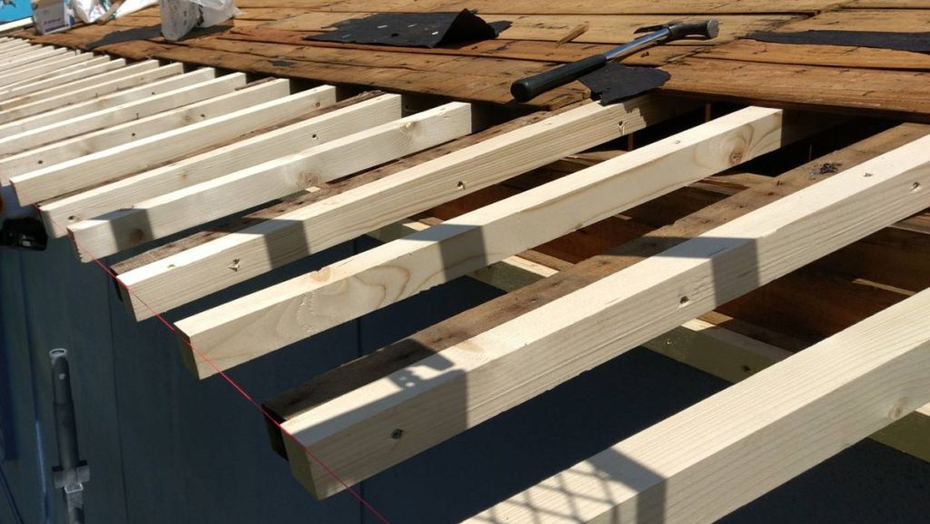 屋根材を解体して、垂木、バラ板、唐草破風下地などを 腐食部分を取り換えたり使える木材は残して補強し、木下地をきっちりと仕上げます。